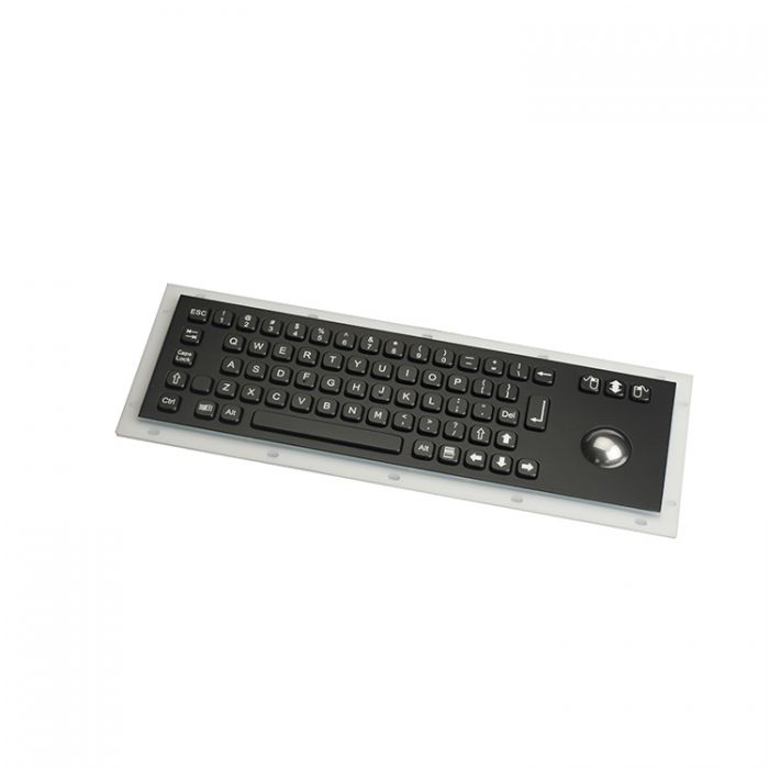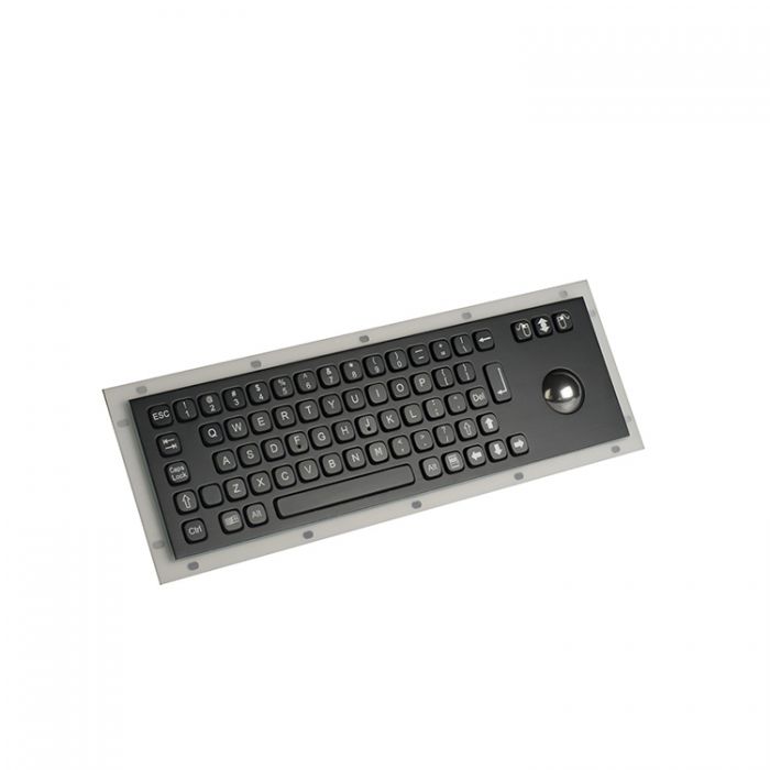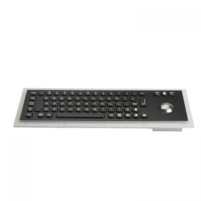69 keys compact format IP65 dynamic vandal proof stainless steel industrial keyboard with 38.0mm trackball model, industrial PCB with carbon-on-gold key switch technology with long stroke (2.0mm) with extremely good tactile feeling for fast and accurate data input without any noise, one complete silicone rubber along mounting aluminium plate for easy mounting & sealing tightly with cabinet, 3 mouse buttons designed for right & left clicking and scrolling up and down with ball rolling. High quality durable black titanium electroplated on the top stainless steel plate and all keys, rear panel mounting solution.4 optional trackball modules: IP65 static mechanical trackball module with 400 DPI, IP65 static chameleon trackball module with 400 DPI, IP68 dynamic optical trackball module with 800 DPI,IP68 dynamic laser trackball module with 1200 DPI