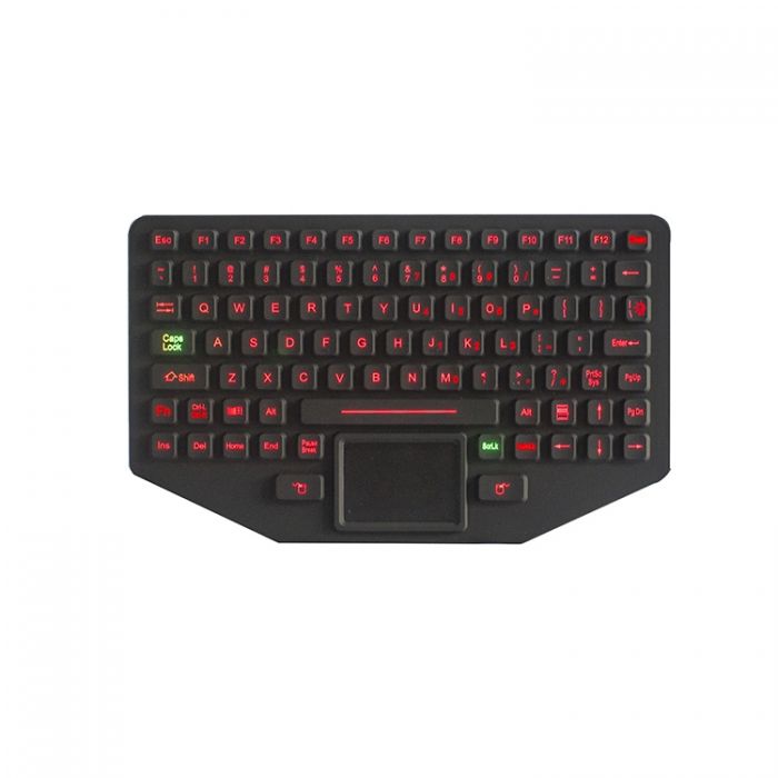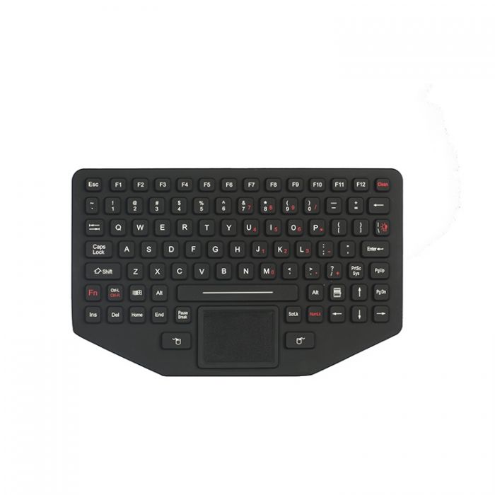 89 keys IP65 dynamic sealed and ruggedized silicone rubber industrial keyboard with full keyboard functionalities with sealed & ruggedized tough touchpad for fast and accurate cursor position, 12 FN keys (F1, F2…F11, F12) are on top line for easy operation, with industrial PCB with carbon-on-gold key switch technology with long stroke (1.50mm) with extremely good tactile feeling for fast and accurate data input without any noise, with durable coating & antimicrobial keyboard surface withstand to most chemicals and liquids under harsh environment, FN + CLEAN combination key to lock/disable the keyboard for easy cleaning without needing to take away the keyboard from PC, industrial PCB with stainless steel back plate sealed and ruggedized with top industrial silicone cover & industrial PCB for ruggedized structure and easy mounting and sealing, stainless steel housing protects the electronics controller, industrial level with adjustable backlight included. Dimensions: 275.0mm x 169.60mm (top panel)
